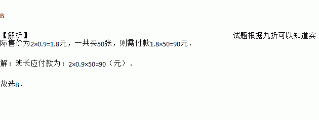 (2009•深圳)班长去文具店买毕业留言卡50张,每张标价2元,店老板说可以按标价九折优惠,则班长应付( )