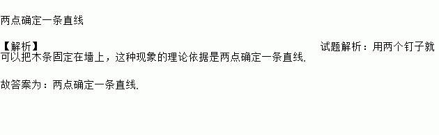 两点确定一条直线 【解析】试题解析:用两个钉子就可以把木条固定在墙上,这种现象的理论依据是两点确定一条直线. 故答案为:两点确定一条直线.