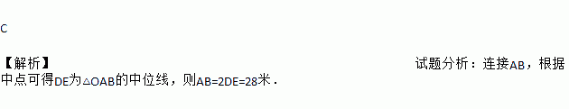 如图,为测量池塘边A、B两点的距离,小明在池塘的一侧选取一点O,测得OA、OB的中点分别是点D、E,且DE=14m,则A、B间的距离是( )