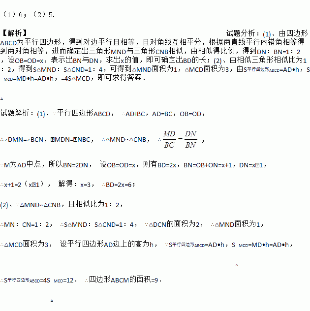 如图,在平行四边形ABCD中,对角线AC、BD交于点O.M为AD中点,连接CM交BD于点N,且ON=1.