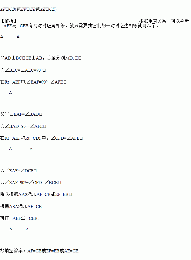 如图,在△ABC中,AD⊥BC,CE⊥AB,垂足分别为D,E,AD,CE交于点F.请你添加一个适当的条件,使△AEF≌△CEB.添加的条件是____________(写出一个即可).