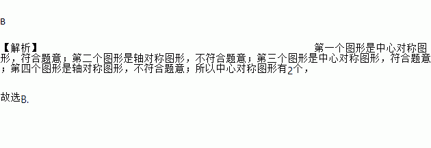 B 【解析】第一个图形是中心对称图形,符合题意;第二个图形是轴对称图形,不符合题意;第三个图形是中心对称图形,符合题意;第四个图形是轴对称图形,不符合题意;所以中心对称图形有2个, 故选B.