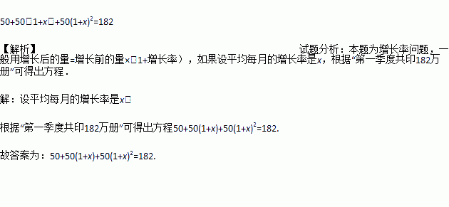 某印刷厂一月份印刷了科技书籍50万册,第一季度共印182万册,设平均每月的增长率是,则列方程为___________.