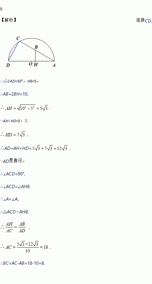 Èçͼ£¬ADºÍAC·Ö±ðÊǰëÔ²OµÄÖ±¾¶ºÍÏÒ£¬ÇÒ¡ÏCAD=30¡ã£¬µãBÊÇACÉϵĵ㣬BH¡ÍAD½»ACÓÚµãB£¬´¹×ãΪµãH£¬ÇÒAH:HD=5£º7.ÈôHB=5£¬ÔòBC=_______£®