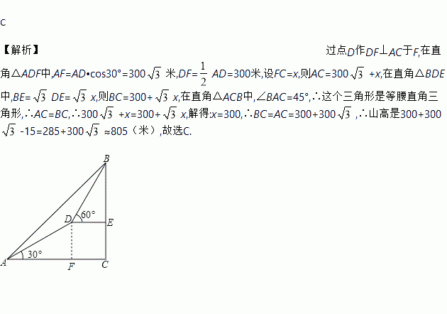 某测量队在山脚A处测得山上树顶仰角为45°(如图),测量队在山坡上前进600米到D处,再测得树顶的仰角为60°,已知这段山坡的坡角为30°,如果树高为15米,则山高为( )(精确到1米,