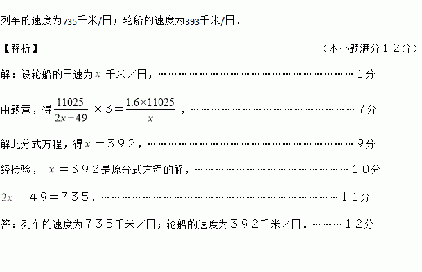 我国实施的“一带一路”战略方针,惠及沿途各国.中欧班列也已融入其中.从我国重庆开往德国的杜伊斯堡班列,全程约11025千米.同样的货物,若用轮船运输,水路路程是铁路路程的1.6倍,水路所用天数是铁路所用天数的3倍,列车平均日速(平均每日行驶的千米数)是轮船平均日速的2倍少49千米.分别求出列车及轮船的平均日速.