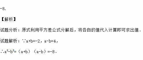 -8. 【解析】 试题分析:原式利用平方差公式分解后,将各自的值代入计算即可求出值. 试题解析:∵a+b=-2,a-b=4, ∴a2-b2=(a+b)(a-b)=-8.