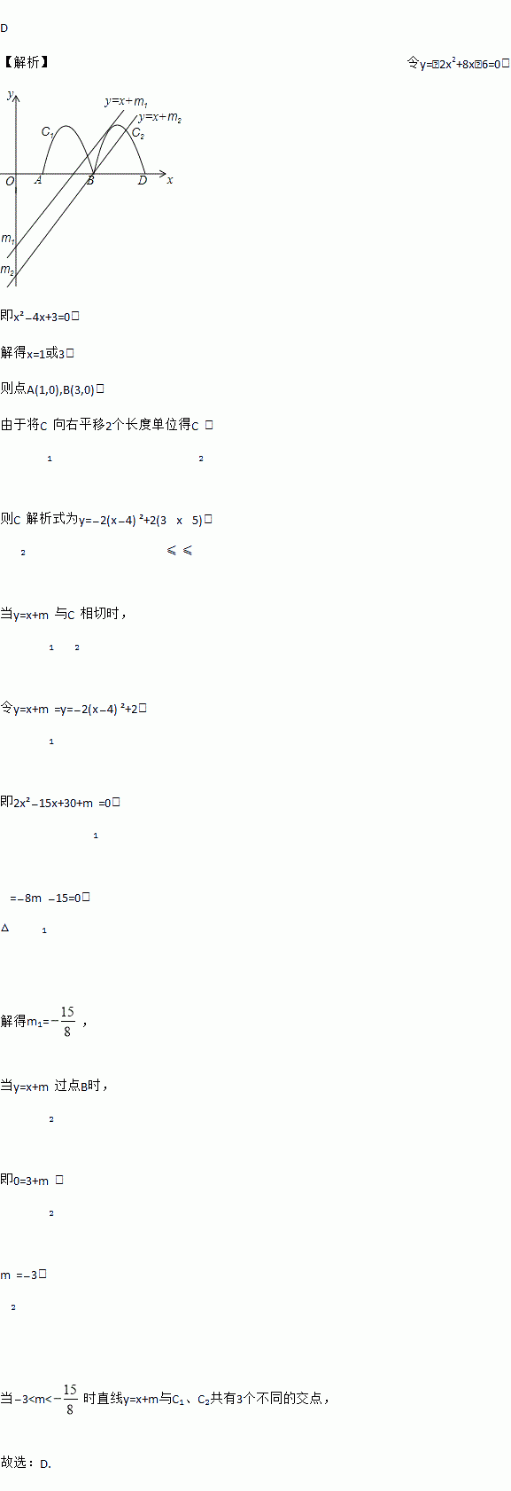 如图,抛物线y=﹣2x2+8x﹣6与x轴交于点A、B,把抛物线在x轴及其上方的部分记作C1,将C1向右平移得C2,C2与x轴交于点B,D.若直线y=x+m与C1、C2共有3个不同的交点,则m的取值范围是( )