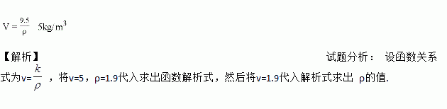 一定质量的二氧化碳,其体积V(m3)是密度(kg/m3) 的反比例函数,请你根据图中的已知条件,下出反比例函数的关系式____________,当V=1.9m3时,=__________.