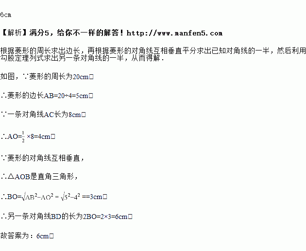 已知菱形的周长是20cm,一条对角线长为8cm,则菱形的另一条对角线长为_____