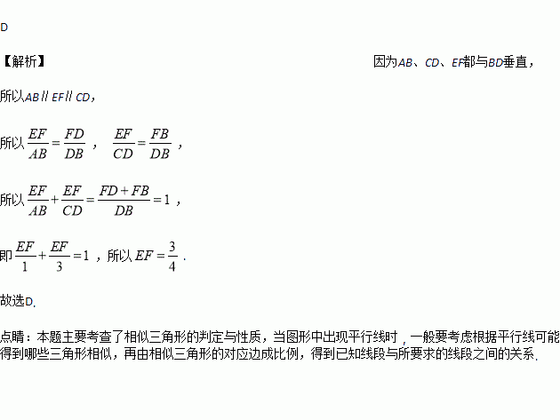 如图,已知AB、CD、EF都与BD垂直,垂足分别是B、D、F,且AB=1,CD=3,则EF的长是( )
