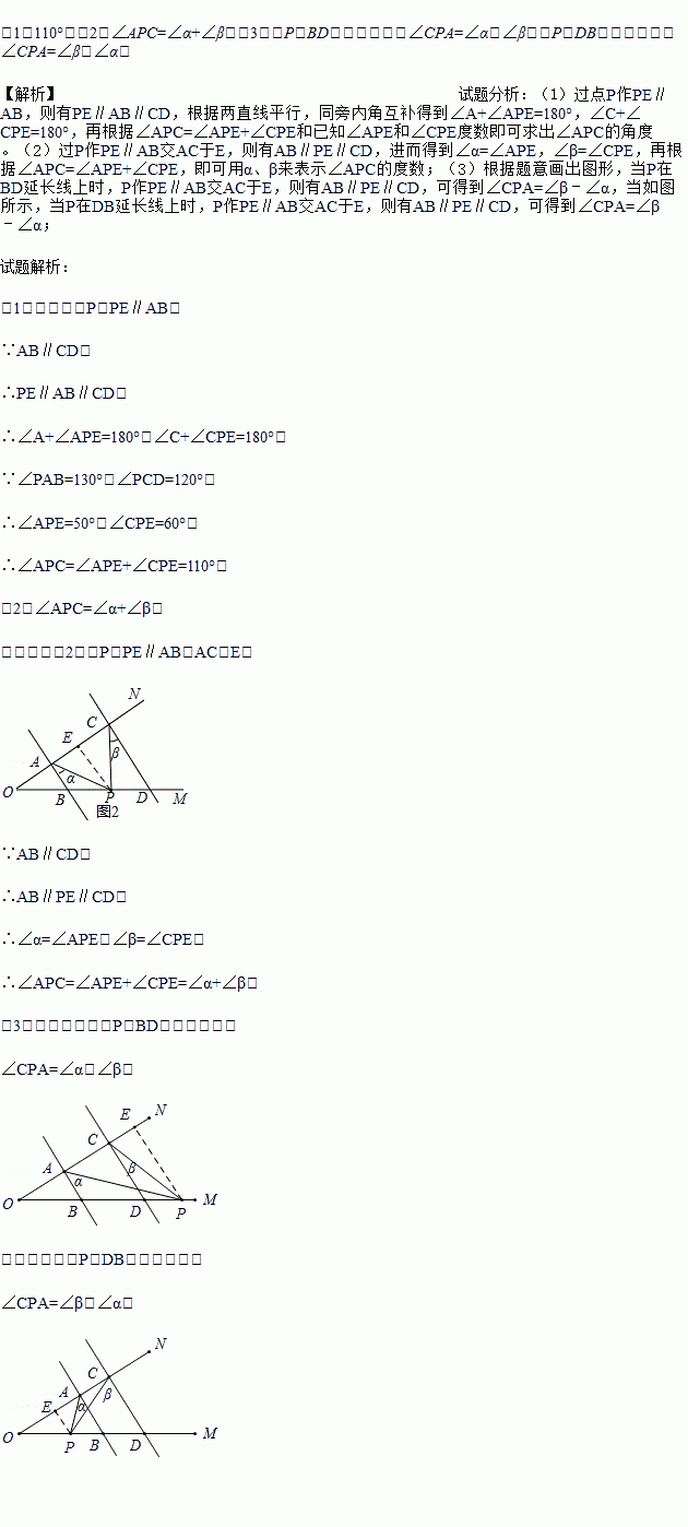 (2)问题迁移:如图2,AB∥CD,点P在射线OM上运动,记∠PAB=α,∠PCD=β,当点P在B、D两点之间运