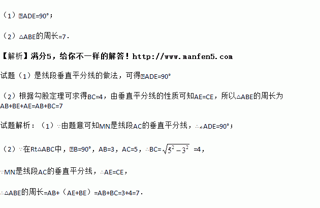 长为半径画弧,两弧相交于点M、N,连结MN,与AC、BC分别交于点D、E,连结AE.