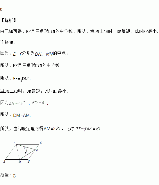 如图,在?ABCD中,,,点M、N分别是边AB、BC上的动点,连接DN、MN,点E、F分别为DN、MN的中点,连接EF,则EF的最小值为