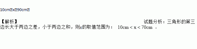 10cm<x<90cm. 【解析】试题分析:三角形的第三边长大于两边之差,小于两边之和,则x的取值范围为: .