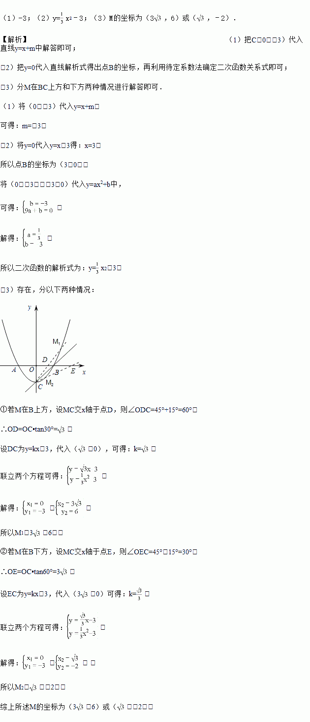如图,已知顶点为C(0,﹣3)的抛物线y=ax2+b(a≠0)与x轴交于A,B两点,直线y=x+m过顶点C和点B.