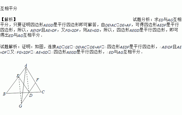 如图所示,已知D,E,F分别在△ABC的边BC,AB,AC上,且DE∥AF,DE=AF,将FD延长至G,使FG=2DF,连接AG,则ED,AG互相平分吗?请说明理由.