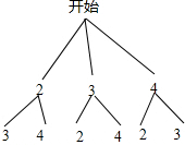 总共的组合为:(2,3),(3,2),(2,4),(4,2),(3,4),(4,3)共6中,