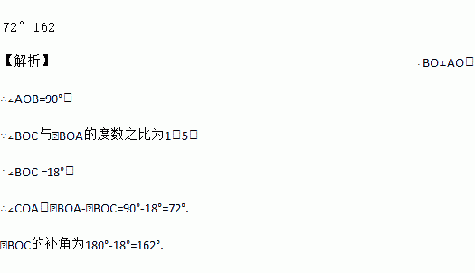 如图,BO⊥AO,∠BOC与∠BOA的度数之比为1:5,那么∠COA=_____,∠BOC的补角为______度.