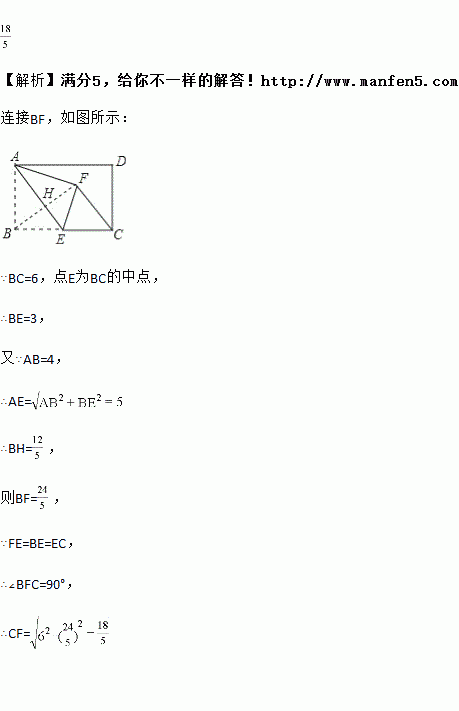 如图,在矩形ABCD中,AB=4,BC=6,点E为BC的中点,将△ABE沿AE折叠,使点B落在矩形内点F处,连接CF,则CF的长为___________.