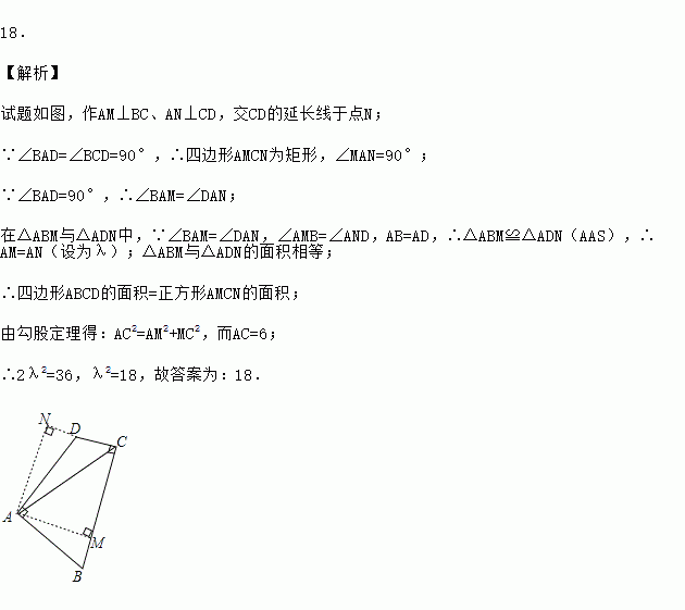 如图,在四边形ABCD中,AB=AD,∠BAD=∠BCD=90°,连接AC.若AC=6,则四边形ABCD的面积为 .