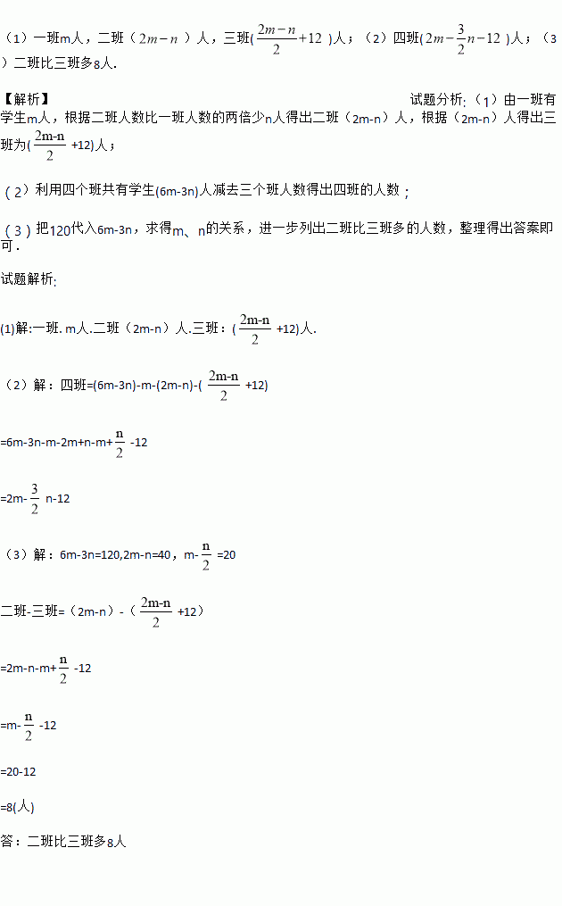 (1)一班m人,二班()人,三班()人;(2)四班()人;(3)二班比三班多8人. 【解析】试题分析: (1)由一班有学生m人,根据二班人数比一班人数的两倍少n人得出二班(2m-n)人,根据(2m-n)人得出三班为(+12)人; (2)利用四个班共有学生(6m-3n)人减去三个班人数得出四班的人数; (3)把120代入6m-3n,求得m、n的关系,进一步列出二班比三班多的人数,整...