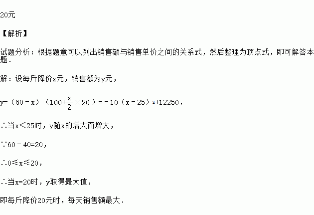 广东特产专卖店销售龙眼干,其进价为每斤40元,按每斤60元出售,平均每天可售出100斤,后来经调查发现,单价每降低2元,则平均每天的销售量增加20斤.每斤降价多少元,每天销售额最大?