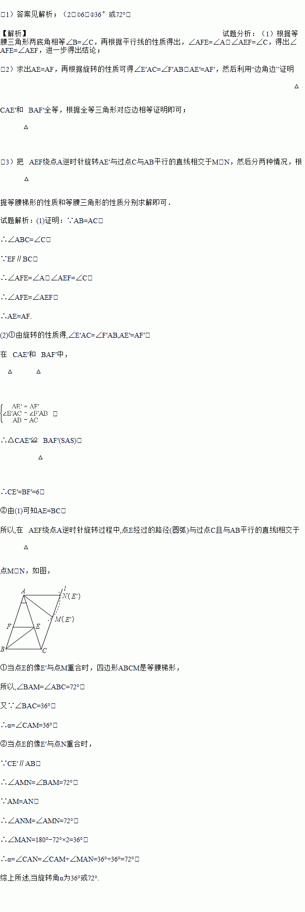 ②若∠EBC=∠BAC=36°,在图②的旋转过程中,当CE′∥AB时,直接写出旋转角α的大小.