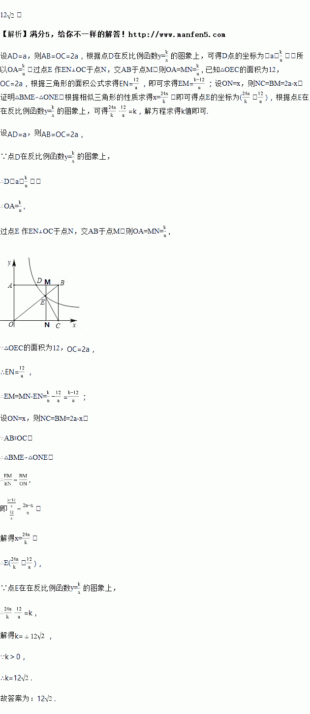 的图象在第一象限的分支过AB的中点D交OB于点E,连接EC,若△OEC的面积为12,则k=_____.