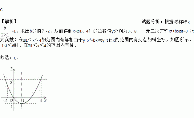 C 【解析】试题分析:根据对称轴x==1,求出b的值为-2,从而得到x=﹣1、4时的函数值y分别为3、8,一元二次方程x2+bx﹣t=0(t为实数)在﹣1<x<4的范围内有解相当于y=x2+bx与y=t在x的范围内有交点的横坐标,如图所示,-1≤t<8时,在﹣1<x<4的范围内有解. 故选:C.