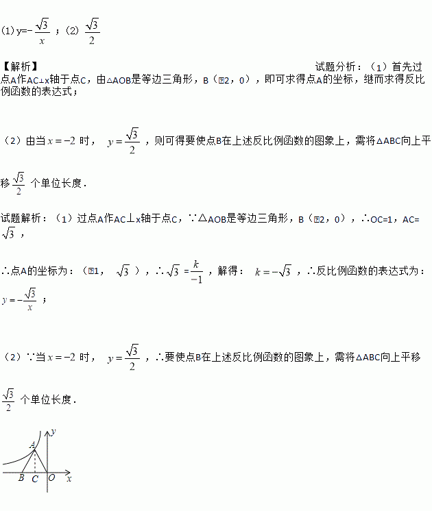 (1)y=-;(2) 【解析】试题分析:(1)首先过点A作AC⊥x轴于点C,由△AOB是等边三角形,B(﹣2,0),即可求得点A的坐标,继而求得反比例函数的表达式; (2)由当时, ,则可得要使点B在上述反比例函数的图象上,需将△ABC向上平移个单位长度. 试题解析:(1)过点A作AC⊥x轴于点C,∵△AOB是等边三角形,B(﹣2,0),∴OC=1,AC=, ∴点A的坐标为...