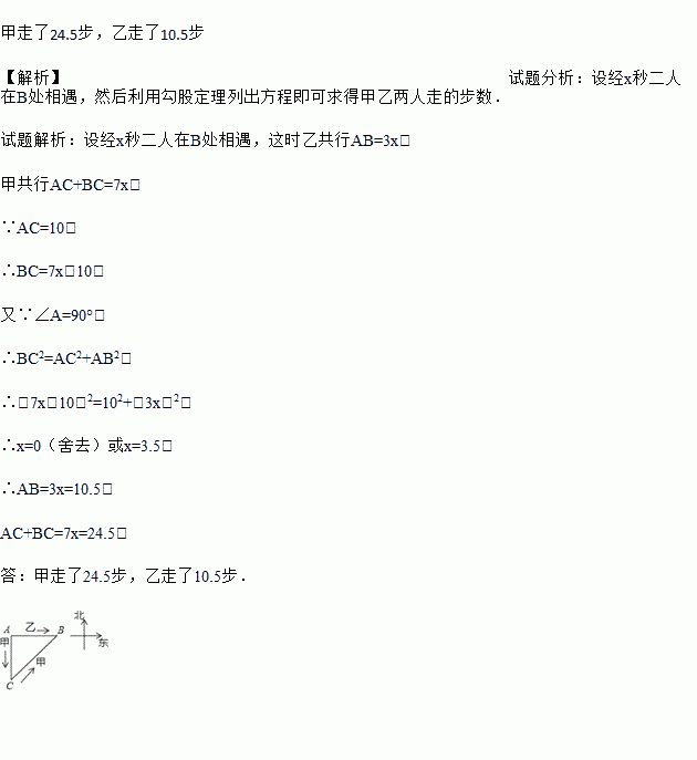 点出发,甲的速度为7,乙的速度为3.乙一直向东走,甲先向南走10步,后又斜向北偏东方向走了一段后与乙相遇.那么相遇时,甲、乙各走了多远?