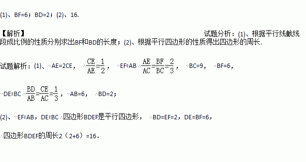 如图,已知在△ABC中,DE∥BC,EF∥AB,AE=2CE,AB=6,BC=9.求: