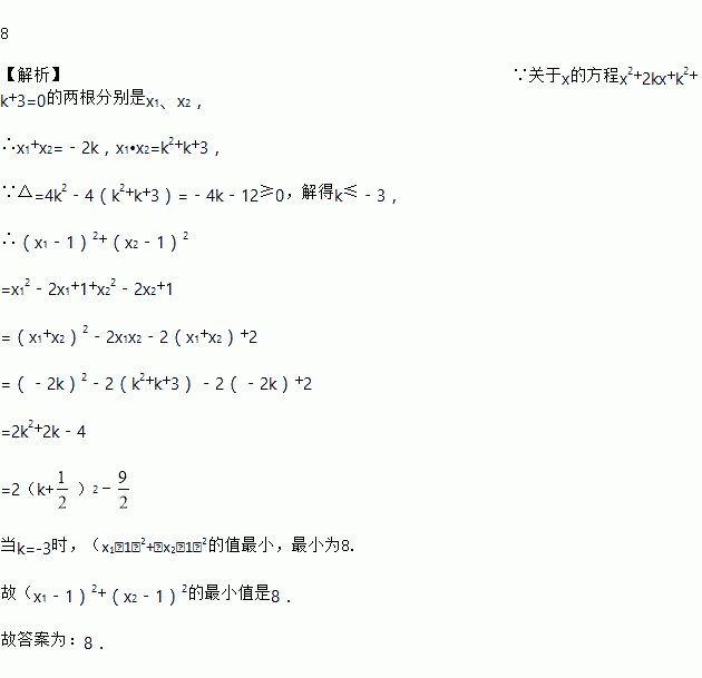 已知关于x的方程x2+2kx+k2+k+3=0的两根分别是x1、x2,则(x1﹣1)2+(x2﹣1)2的最小值是_____.