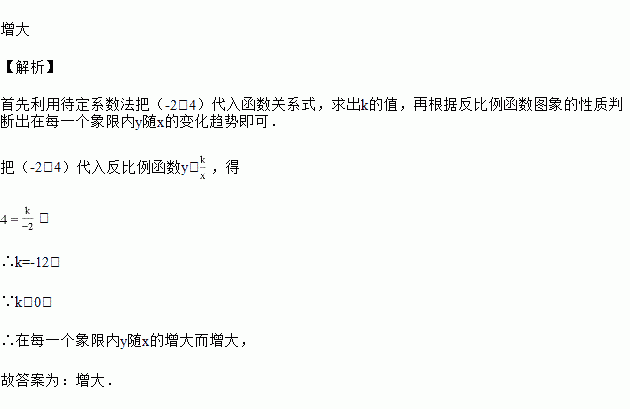 反比例函数y=(k≠0)的图象经过点A(﹣2,4),则在每一个象限内,y随x的增大而_____.(填“增大”或“减小”)