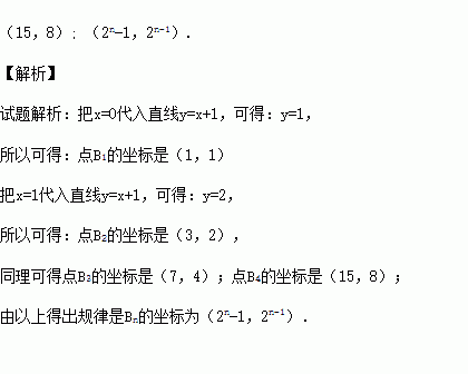 在平面直角坐标系xOy中,记直线y=x+1为l.点A1是直线l与y轴的交点,以A1O为边作正方形A1OC1B1,使点C1落在在x轴正半轴上,作射线C1B1交直线l于点A2,以A2C1为边作正方形A2C1C2B2,使点C2落在在x轴正半轴上,依次作下去,得到如图所示的图形.则点B4的坐标是 ,点Bn的坐标是 .