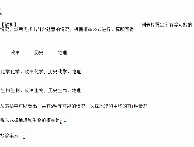 ´Ó2018Äê¸ßÖÐÒ»Ä꼶ѧÉú¿ªÊ¼£¬ºþÄÏÊ¡È«ÃæÆô¶¯¸ß¿¼×ۺϸĸѧÉúѧϰÍê±ØÐ޿γ̺󣬿ÉÒÔ¸ù¾Ý¸ßУÏà¹Ø×¨ÒµµÄÑ¡¿ÎÒªÇóºÍ×ÔÉíÐËȤ¡¢Ö¾Ïò¡¢ÓÅÊÆ£¬´Ó˼ÏëÕþÖΡ¢ÀúÊ·¡¢µØÀí¡¢ÎïÀí¡¢»¯Ñ§¡¢ÉúÎï6¸ö¿ÆÄ¿ÖУ¬×ÔÖ÷Ñ¡Ôñ3¸ö¿ÆÄ¿²Î¼ÓµÈ¼¶¿¼ÊÔ.ѧÉúÒÑÑ¡ÎïÀí£¬»¹Ïë´Ó˼ÏëÕþÖΡ¢ÀúÊ·¡¢µØÀí3¸öÎĿƿÆÄ¿ÖÐÑ¡1¿Æ£¬ÔÙ´Ó»¯Ñ§¡¢ÉúÎï2¸öÀí¿Æ¿ÆÄ¿ÖÐÑ¡1¿Æ.ÈôËûѡ˼ÏëÕþÖΡ¢ÀúÊ·¡¢µØÀíµÄ¿ÉÄÜÐÔÏàµÈ£¬Ñ¡»¯Ñ§¡¢ÉúÎïµÄ¿ÉÄÜÐÔÏàµÈ£¬ÔòÑ¡ÐÞµØÀíºÍÉúÎïµÄ¸ÅÂÊΪ___________.![]()