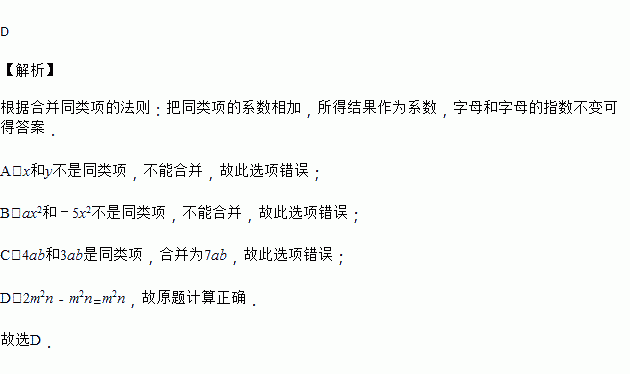 A. x+y=2xy B. ax2﹣5x2=1 C. 4ab+3ab=7a2b2 D. 2m2n﹣m2n=m2n
