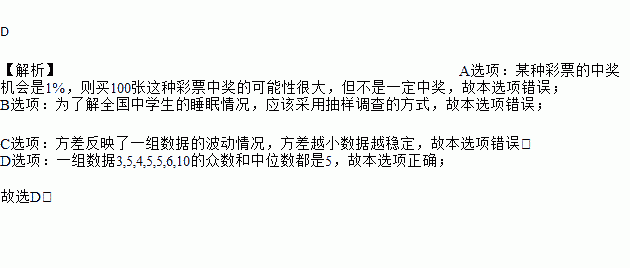 D 【解析】A选项:某种彩票的中奖机会是1%,则买100张这种彩票中奖的可能性很大,但不是一定中奖,故本选项错误; B选项:为了解全国中学生的睡眠情况,应该采用抽样调查的方式,故本选项错误; C选项:方差反映了一组数据的波动情况,方差越小数据越稳定,故本选项错误; D选项:一组数据3,5,4,5,5,6,10的众数和中位数都是5,故本选项正确; 故选D.