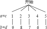 将长度为20厘米的线段截成四条线段a、b、c、d (a、b、c、d长度均为整数,且a=c,b=d).如果截成的a、b、c、d长度分别相同算作同一种截法(如:a=c=9,b=d=1和a=c=1,b=d=9为同一种截法),那么以截成的a、b、c、d为边(其中a与c为对边,b与d为对边),3厘米长为其中的一条对角线画平行四边形,能画出满足条件的平行四边形的概率是________.
