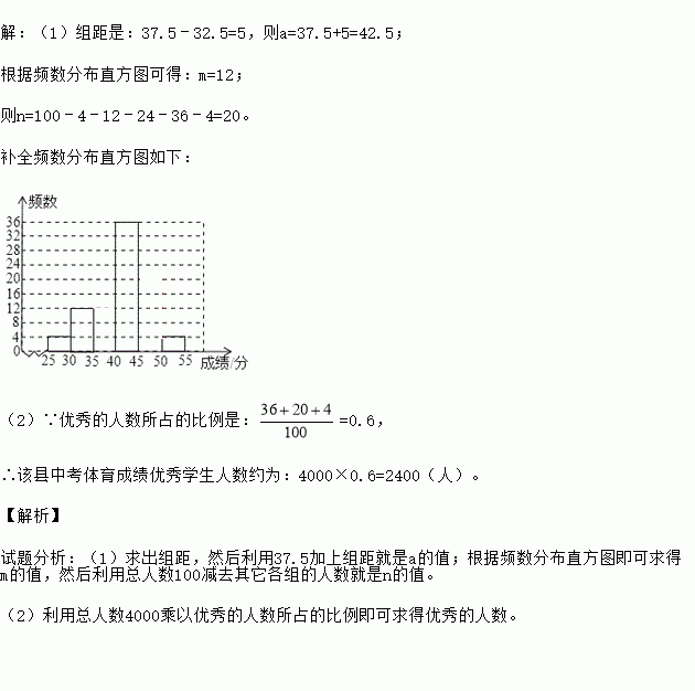 (2)若体育得分在40分以上(包括40分)为优秀,请问该县中考体育成绩优秀学生人数约为多少?