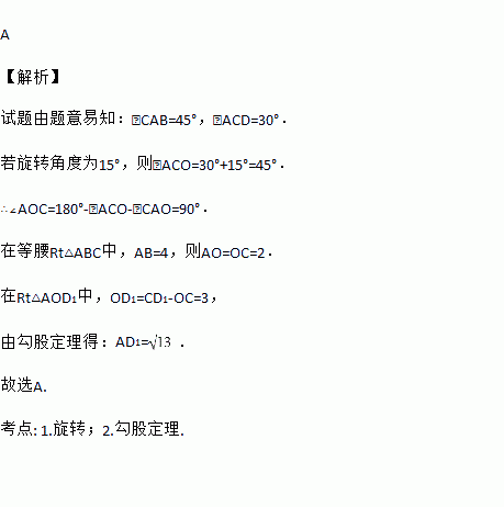把一副三角板如图(1)放置,其中∠ACB=∠DEC=90°,∠A=45°,∠D=30°,斜边AB=4,CD=5.把三角板DCE绕着点C顺时针旋转15°得到△D1CE1(如图2),此时AB与CD1交于点O,则线段AD1的长度为( )