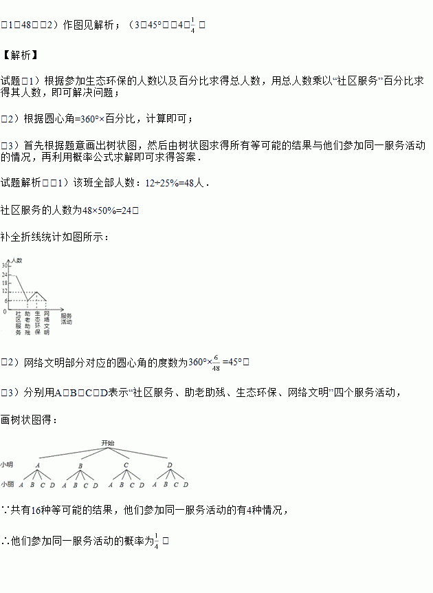 (2017山东省东营市)为大力弘扬“奉献、友爱、互助、进步”的志愿服务精神,传播“奉献他人、提升自我”的志愿服务理念,东营市某中学利用周末时间开展了“助老助残、社区服务、生态环保、网络文明”四个志愿服务活动(每人只参加一个活动),九年级某班全班同学都参加了志愿服务,班长为了解志愿服务的情况,收集整理数据后,绘制以下不完整的统计图,请你根据统计图中所提供的信息解答下列问题: