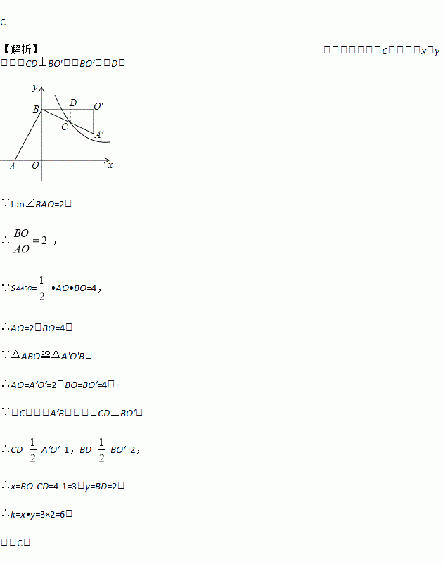C 【解析】试题解析:设点C坐标为(x,y),作CD⊥BO′交边BO′于点D, ∵tan∠BAO=2, ∴, ∵S△ABO=•AO•BO=4, ∴AO=2,BO=4, ∵△ABO≌△A'O'B, ∴AO=A′O′=2,BO=BO′=4, ∵点C为斜边A′B的中点,CD⊥BO′, ∴CD=A′O′=1,BD=BO′=2, ∴x=BO-CD=...