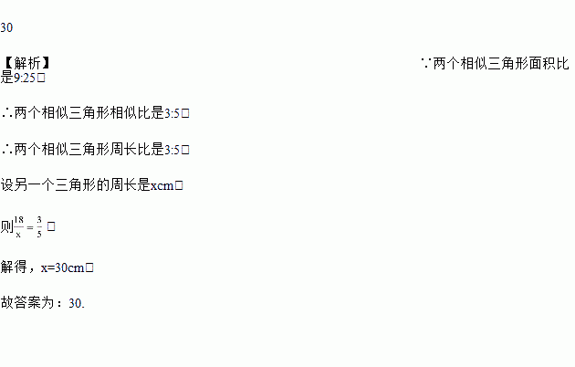 两个相似三角形面积比是9:25,其中较小一个三角形的周长为18cm,则另一个三角形的周长是___cm.