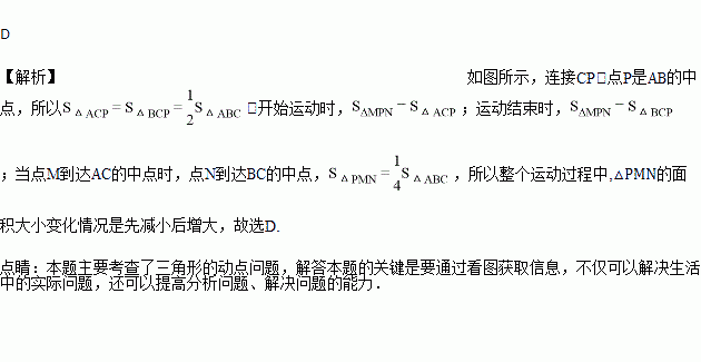 如图,在△ABC中,∠C=90°,点P是斜边AB的中点,点M从点C向点A匀速运动,点N从点B向点C匀速运动,已知两点同时出发,同时到达终点,连接PM、PN、MN,在整个运动过程中,△PMN的面积的变化情况是( )