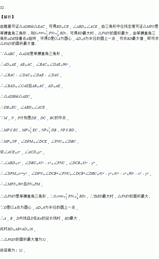 如图,等腰Rt△ABC中,∠BAC=90°,AB=AC=10,等腰直角三角形ADE绕着点A旋转,∠DAE=90°,AD=AE=6,连接BD、CD、CE,点M、P、N分别为DE、DC、BC的中点,连接MP、PN、MN,则△PMN的面积最大值为_____.