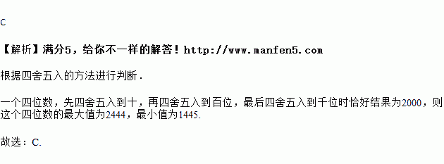 一个四位数,先四舍五入到十,再四舍五入到百位,最后四舍五入到千位时恰好结果为,则这个四位数的最大值和最小值分别是( )![]()