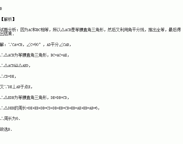 (2010秋•广丰县期末)如图,在△ABC中,∠C=90°,CA=CB,AD平分∠CAB交BC于D,DE⊥AB于点E,且AB=6,则△DEB的周长为( )