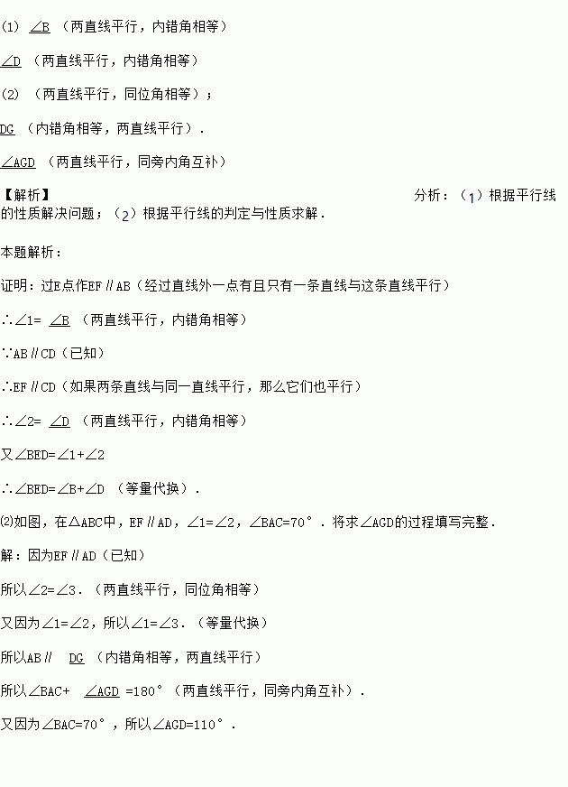 (1) ∠B (两直线平行,内错角相等) ∠D (两直线平行,内错角相等) (2) (两直线平行,同位角相等); DG (内错角相等,两直线平行). ∠AGD (两直线平行,同旁内角互补) 【解析】分析:(1)根据平行线的性质解决问题;(2)根据平行线的判定与性质求解. 本题解析: 证明:过E点作EF∥AB(经过直线外一点有且只有一条直线与这条直线平行) ...